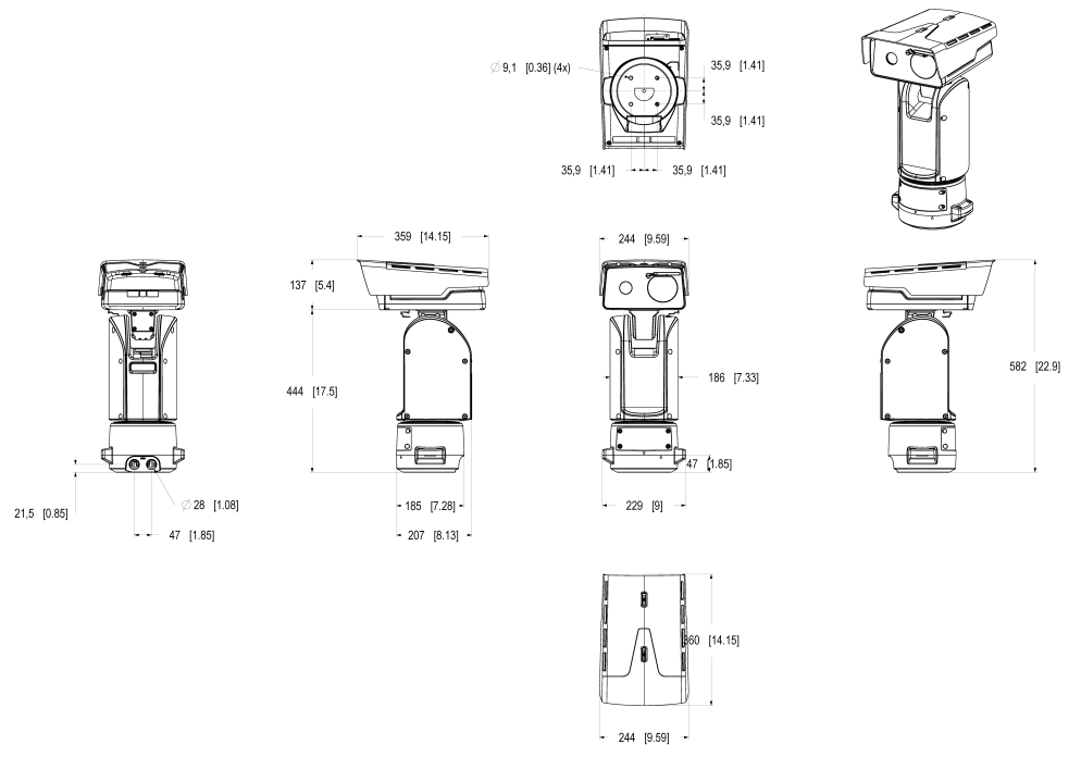| 動作温度 | -40 ℃ ~ 60 ℃(-40 °F ~ 140 °F) NEMA TS 2 (2.2.7) に基づく最高温度:74℃ (165°F) 起動温度:-40 ℃ 湿度:10~100% RH (結露可) PTZ動作時の風荷重 37 m/秒、45 m/秒 (ウェザーシールドなし) AXIS PT IR Illuminator Kit C使用:40 m/秒、52 m/秒 (ウェザーシールドなし) 最大有効投影面積 (EPA):0.121 m2 |